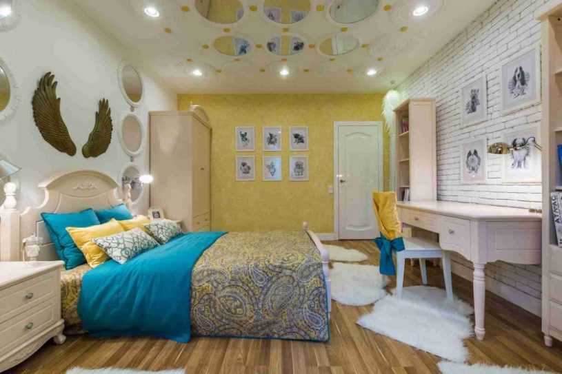 Для девушки-подростка приемлемо акцентировать внимание на некоторых вещах. Так, если вся комната будет светлой, то торшер, подушки, ковер и одна стена могут быть выдержаны в малиновом, голубом или желтом цвете