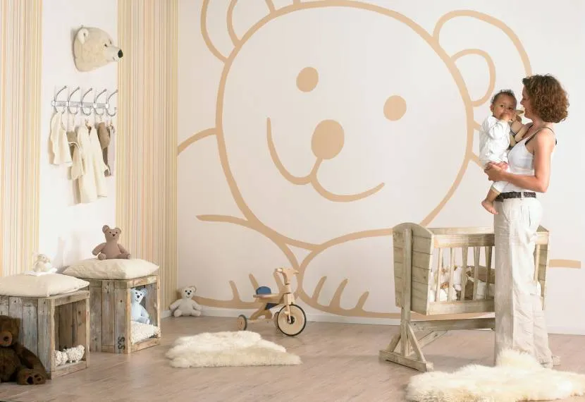 - Совсем крохе (до двухлетнего возраста) желательно оформить часть детской комнаты яркими и красочными обоями.