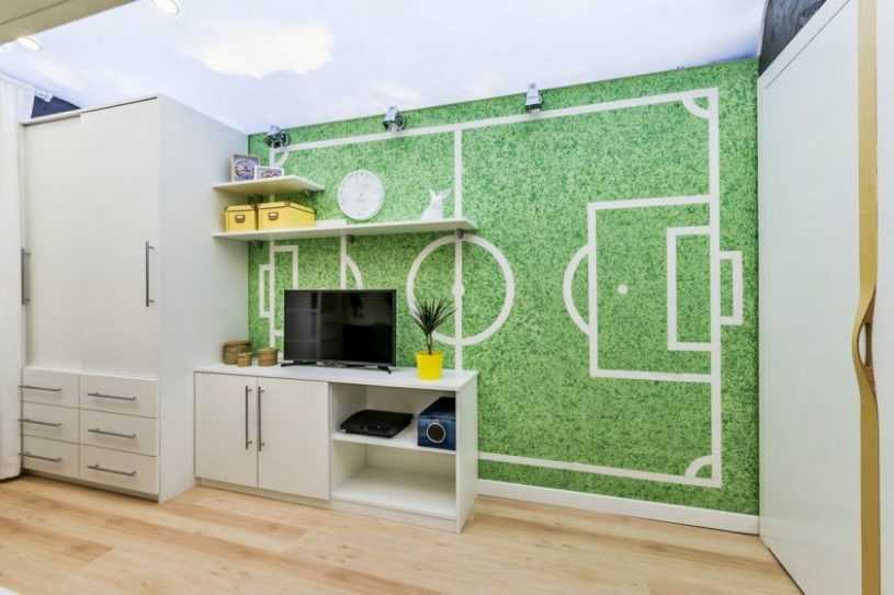На фото комната для парня на тему футбола. Стены отделаны зелеными жидкими обоями с имитацией футбольного поля.