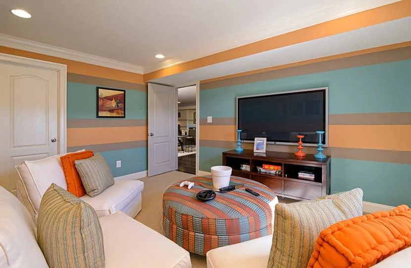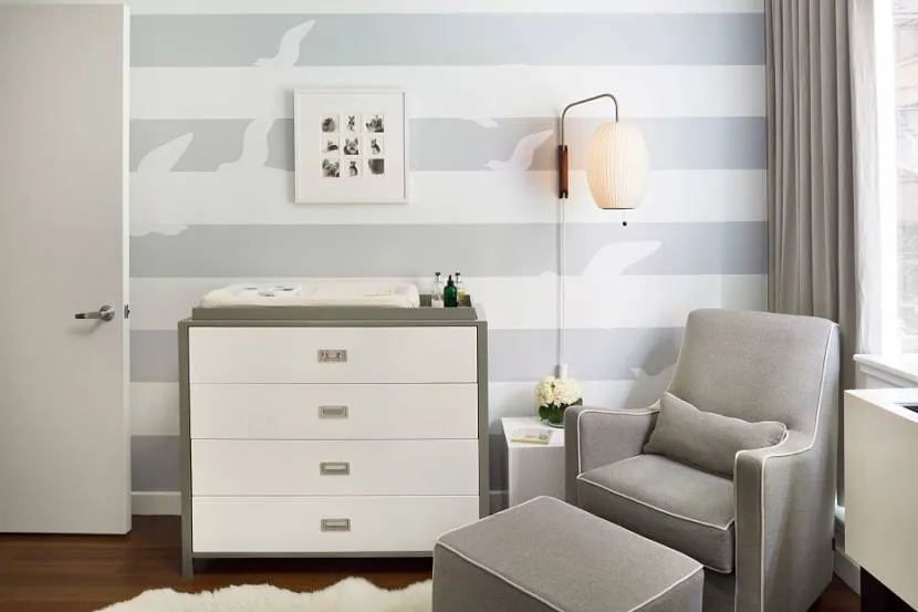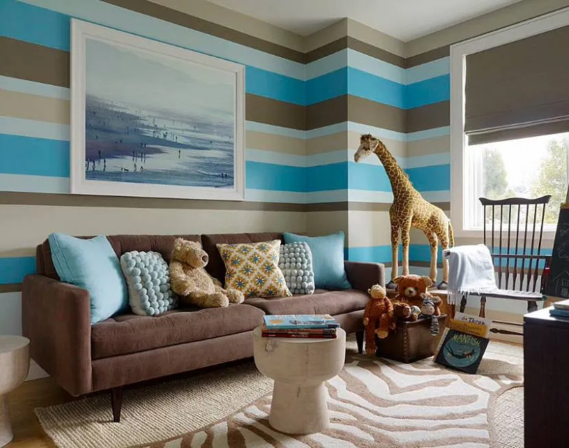 Полоски могут иметь любую ширину и направление, но при выборе оттенка необходимо помнить, какие цвета увеличивают пространство в комнате. Обоями с неконтрастной и светлой полоской можно обклеить всю комнату. Если полоса более насыщенная или контрастная, стоит ограничиться одной-двумя акцентными стенами, а остальные стены сделать нейтральными.