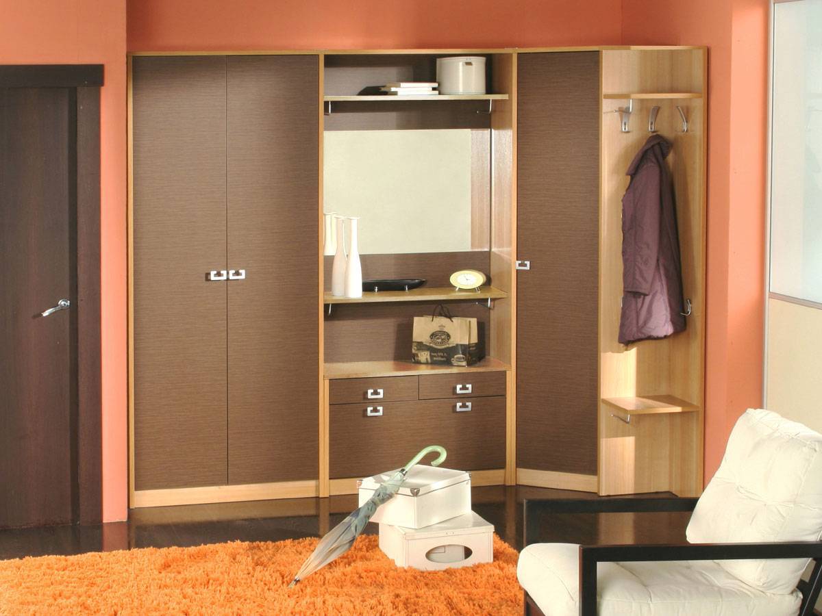 Уходя всегда удобно бегло осмотреть себя, поэтому зеркало. Обувь удобнее одевать сидя, а под сидушкой иметь открытое место для её хранения