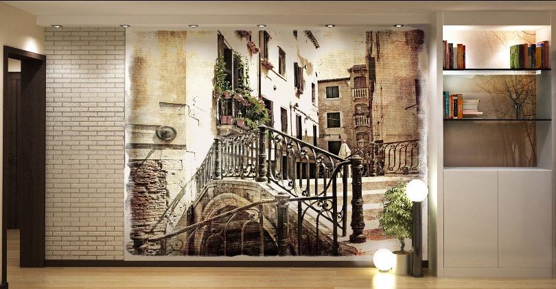 Фотообои, повешенные на стену, сделают даже самую маленькую комнату старого дома настоящими роскошными апартаментами. Возвращаясь с работы в квартиру, где присутствует такой элемент оформления, вы будто попадаете в другой мир, и насыщаетесь энергетикой и спокойствием темных улочек с красивым видом.