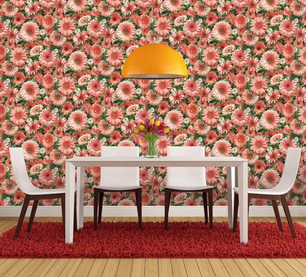 Большие ромашки окрашенные в цвета радуги. Обои с мелкими герберами особенно подойдут для частичной отделки.