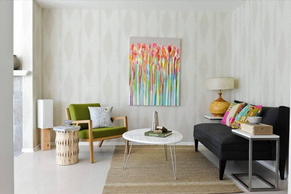 Безусловно запрет на яркие выразительные узоры не возлагается, но нужно понимать, что в компактной гостиной с ними следует действовать очень осторожно. Такого рода принты используйте дозировано, комбинируя с другими поверхностями