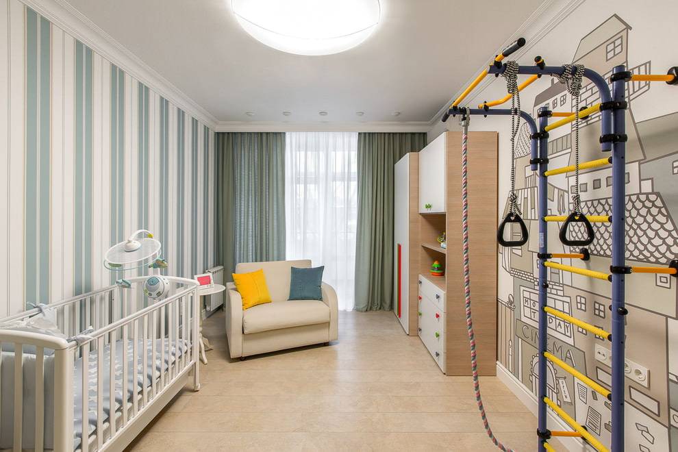 Комната ребенка необычна изначально. Она нуждается в четком зонировании, причем зон тут будет достаточно много, а их предназначение будет зависеть от возраста хозяина апартаментов. Проще всего выделить нужные уголки – оформить стены полосатыми обоями. Для мальчишек подойдет сочетание серого с голубым. Девочки придут в восторг от пудровых розовых красок. Подростки оценят сиренево-фиолетовую палитру. Понравится им и разноцветный минималистический интерьер, в обстановке которого будет подвесное кресло и в кислотной обивке диван. Обилие примеров, как скомбинировать обои в полоску в детской с элементами обстановки, можно найти в интернете.