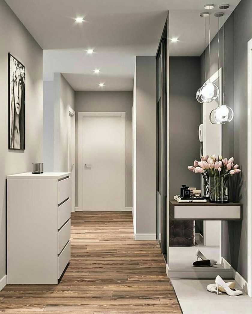 Прихожая и коридор выполняют несколько утилитарных функций – это хранение уличной обуви, верхней одежды, гардеробный шкаф, зеркало, желательно в полный рост, а также разделяет комнаты между собой. Для узкого коридора и небольшой прихожей лучше зонировать по назначению исполняемой функции, выделить её цветом, светом или предметом мебели.
