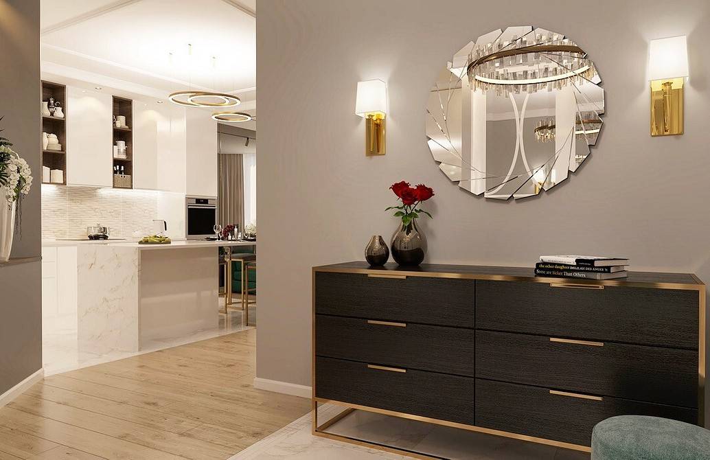 Однотипность серой прихожей разбавляют темными фасадами. Глянцевые раздвижные двери купе привнесут нотки роскоши в нейтральное матовое оформление. На светлом фоне яркой деталью станет черный пенал до потолка или акцентная стена. В маленьком пепельном или жемчужном коридоре уместна лаконичная вешалка и комод.