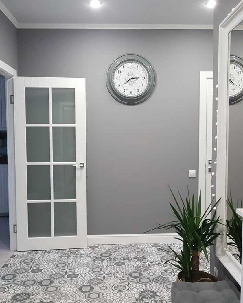 Серые матовые стены с белыми дверными проемами и потолком – красивый вариант, который смотрится эффектно как в классике, так и в скандинавском стиле. Пепельный фон поможет оптически нейтрализовать вытянутую форму помещения. Светлые вставки делают дизайн завершенным и гармоничным.