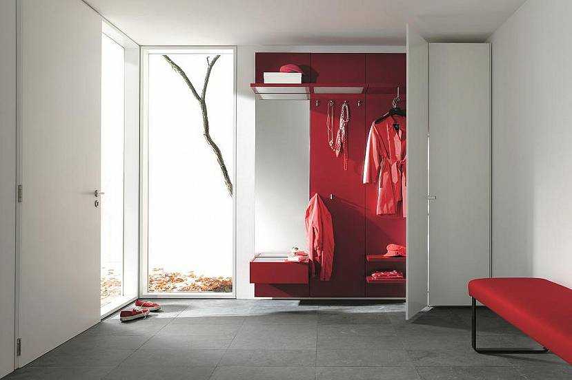 Пламенные оттенки привлекают внимание к декору, отделке или предметам интерьера. В сером коридоре можно повесить картину в красной раме или монтировать алую глянцевую полку. В просторной прихожей карминовый комод станет ярким акцентом пространства