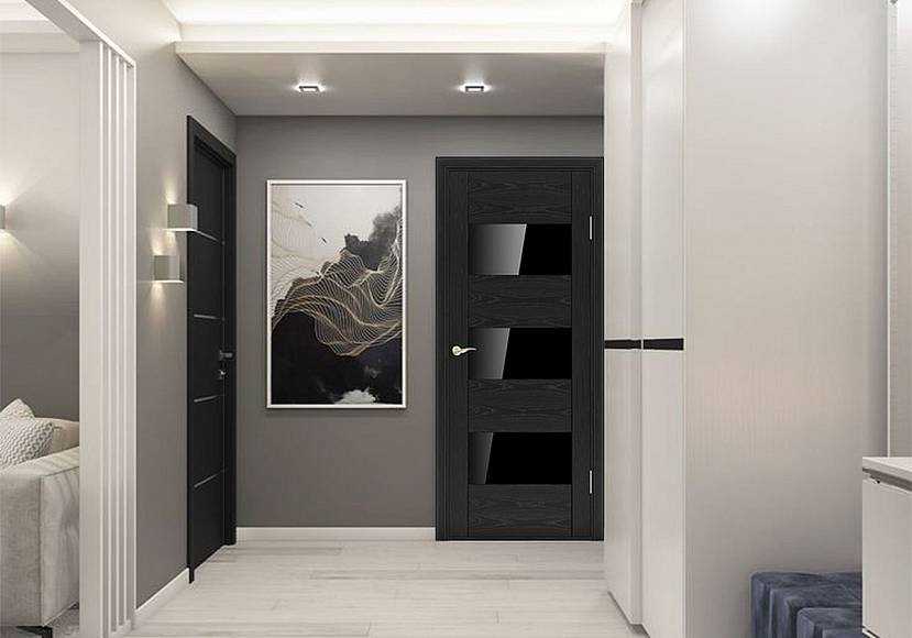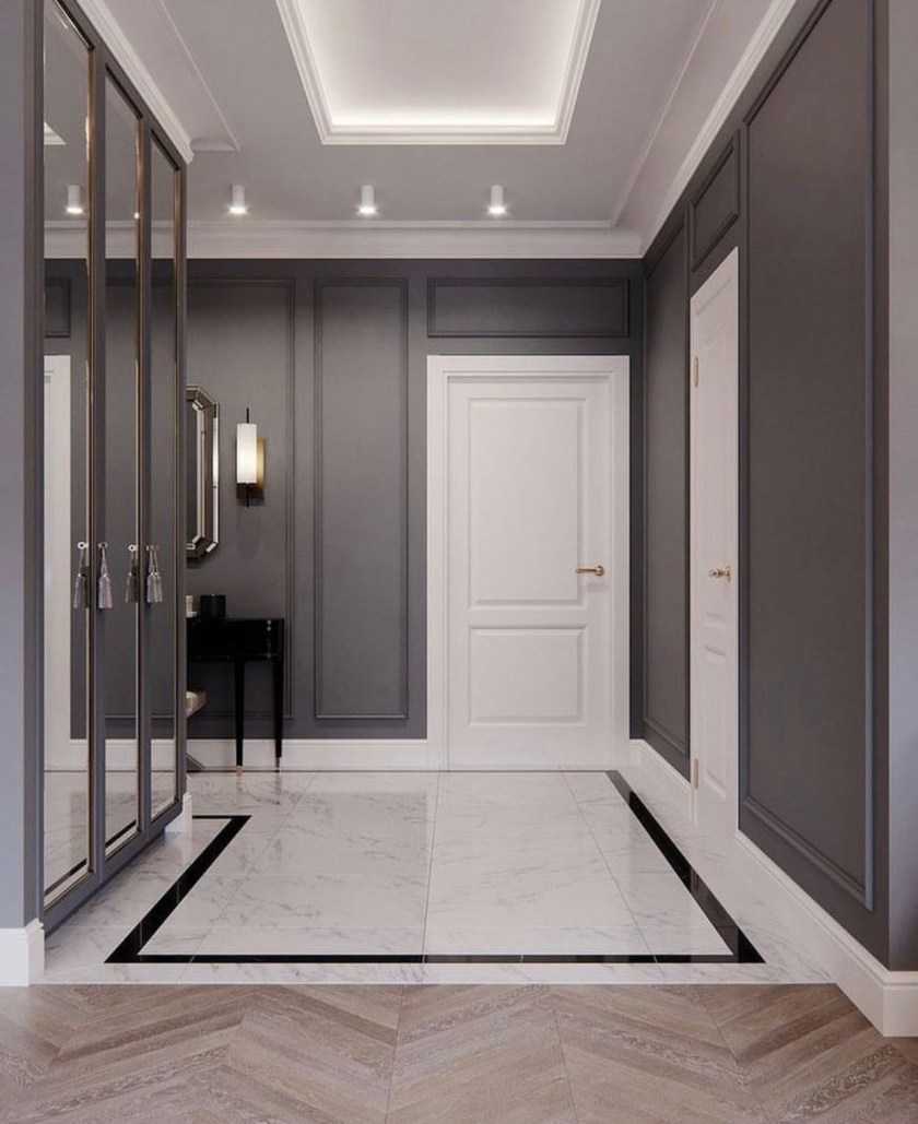 Сочетание белых и серых стен в коридоре визуально увеличивают пространство. В оформлении рекомендуют комбинировать ровные и фактурные поверхности, создавая элегантную отделку. Пепельные или угольные межкомнатные двери станут ярким акцентом интерьера.