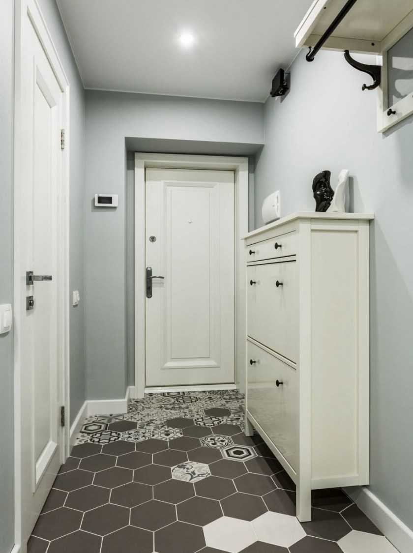 Когда каждая комната квартиры выполнена в своем уникальном стиле и разнообразие бьет по глазам, прихожая создается в сдержанных тонах. Однотонность либо поверхность под покраску только приветствуется.