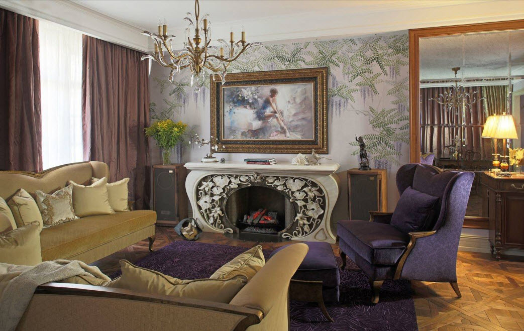 Дизайн зала с жидкими обоями можно решить в любом стиле:
