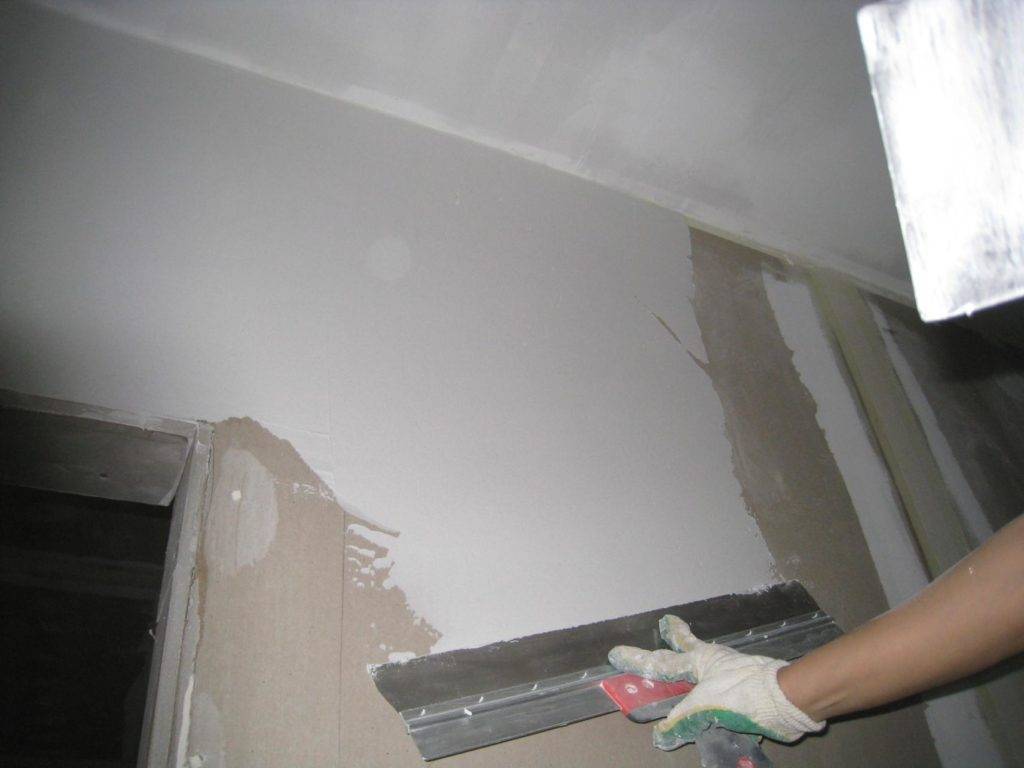 - Через 30 минут после крепления ленты стеклохолста к ГКЛ, широким шпателем проводится финишная операция — наносится выравнивающий слой раствора.