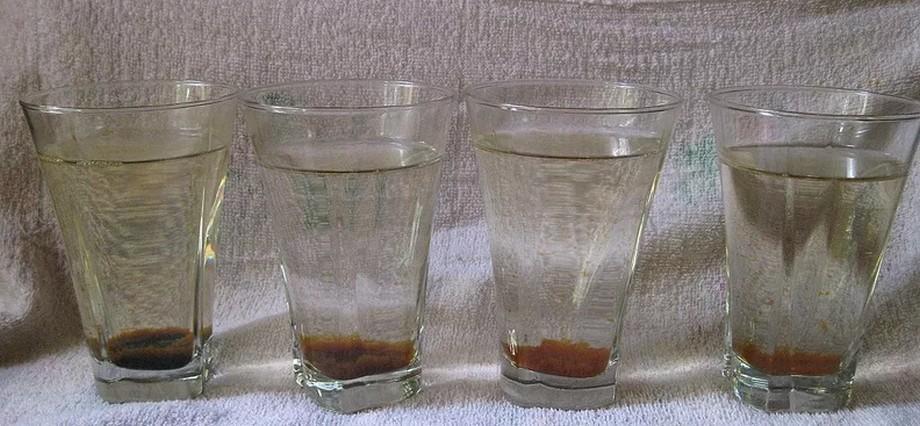 - Трехвалентные. Способны изменять цвет и прозрачность воды. Трехвалентное железо, называемое в обиходе ржавчиной, окрашивает жидкость в бурый оттенок, при длительном отстаивании оно выпадает в осадок.
