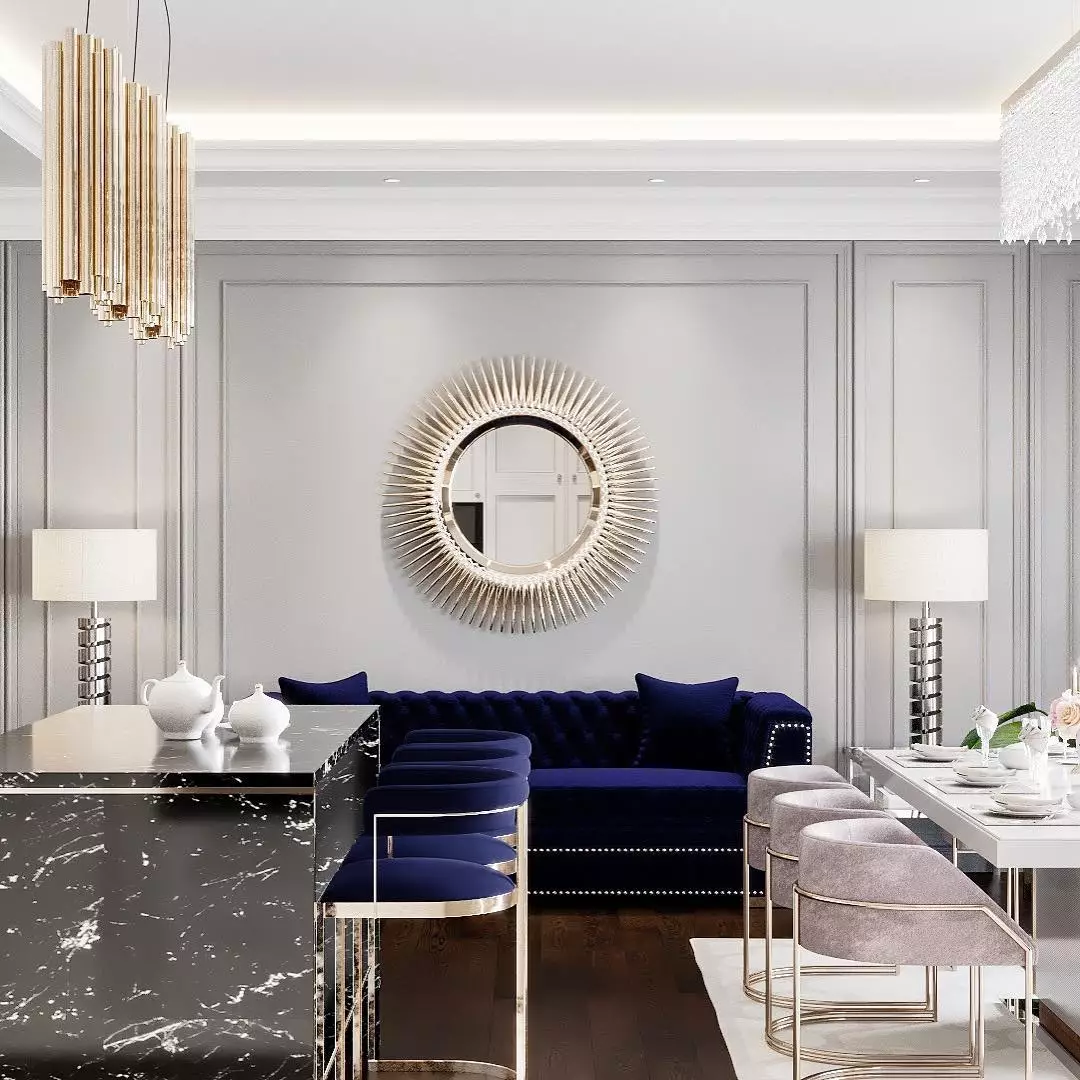 Неоклассическая кухня смотрится свежо, стильно и настраивает на рабочий лад. В ней приятно и готовить, и встречать гостей, и проводить семейные вечера. Для этого обустрой полноценную обеденную зону или остров с барной стойкой – они естественно впишутся в неоклассический интерьер.