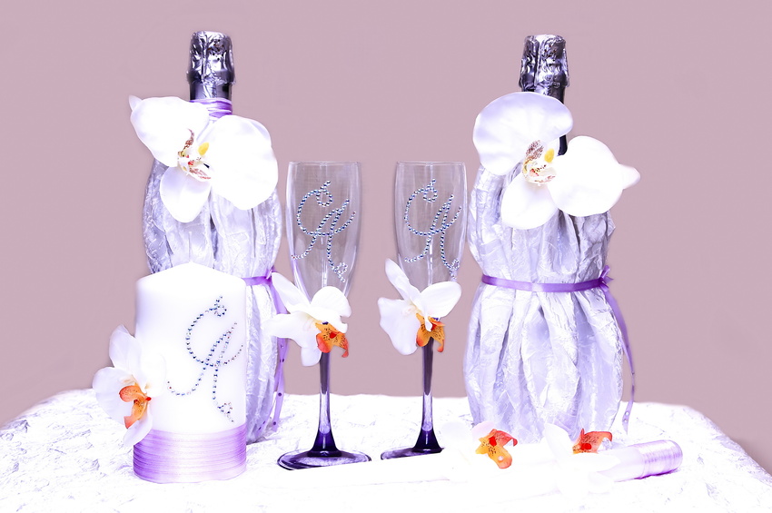 Такое оригинальное оформление будет выглядеть торжественно и оригинально, а выбрать узор можно самостоятельно, правда работу должен выполнять профессиональный мастер. Хотя не нужно думать, что это стоит бешеных денег, вовсе нет. Оформление свадебных бутылок своими руками, посредством гравировки, если особых навыков нет, лучше не пытаться произвести, а то неровен час можно и пораниться, и перед свадьбой, это вовсе неуместно.
