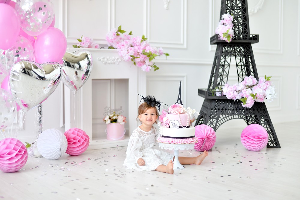 Сначала нужно определиться с цветовой гаммой. Для малышки лучше подойдут нежные светло-розовые или персиковые тона, но следите за тем, чтобы праздничные аксессуары не сливались в одно однотонное пятно, не пестрили яркими разнообразными пятнами – все должно быть гармонично. Однотонную гамму можно разбавить контрастными цветами, а пестрые элементы ограничить в количестве. Когда выбрали цвета, можно приступить к продумыванию форм. Декоративные компоненты могут быть исполнены в виде сердечек, цветочков, зайчиков, кошечек, бабочек.