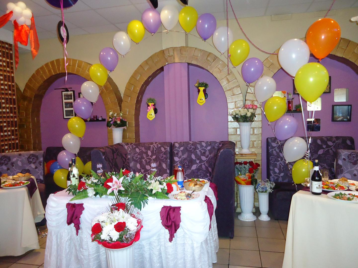 Зону для танцев лучше украсить светящимися гирляндами, серпантином и длинными лентами, разместив их под потолком. Оставив у стен только воздушные шары. Оформляя зону застолья, стоит сделать основной акцент на празднично накрытом столе. Стоит декорировать также и столик для сладкого. Отлично, если торт, капкейки, шоколад и конфеты (и их обертки) выдержаны в единой тематике мероприятия.