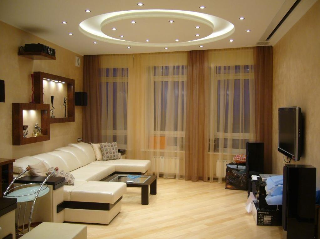 - В маленькой гостиной стараемся отказываться от сложных и громоздких конструкций (двухуровневые или подвесные потолки).