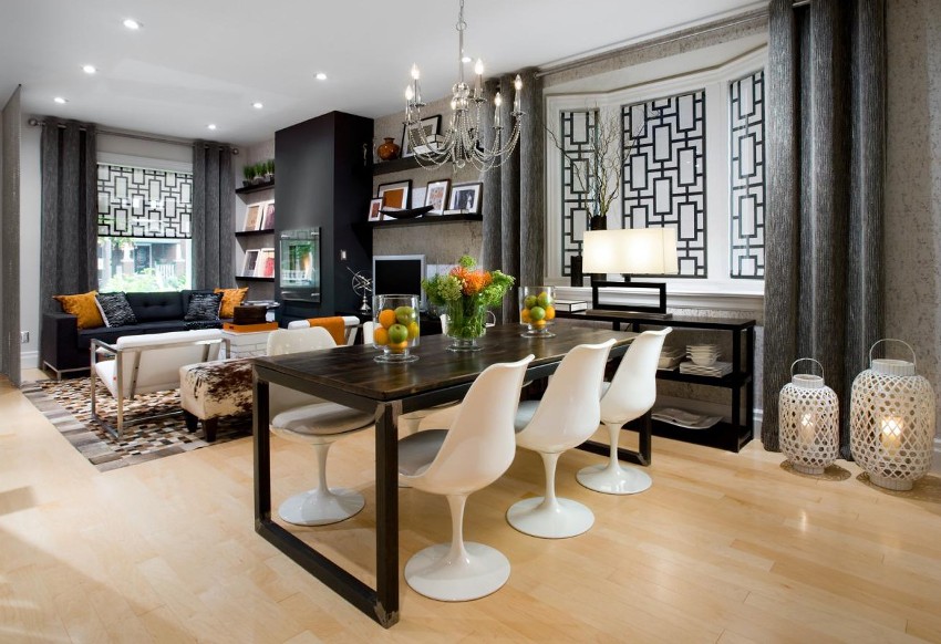 Особенно здорово смотрится столовая зона со скамьей, выстроенной вдоль окна. Скамья позволит сэкономить пространство, ведь в отличие от стульев она не требует запаса места за спинкой и может иметь под сидением встроенные ящики для хранения. Главное, чтобы окно и само помещение было хорошо утеплено и отапливаемо.