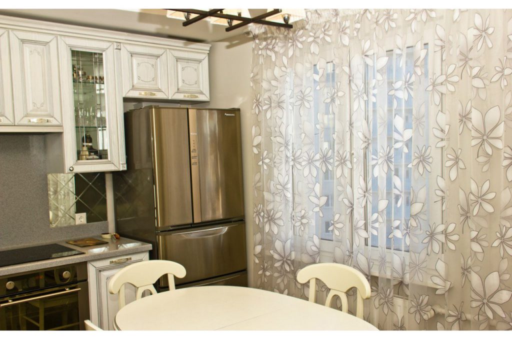 Правильно подобранный оттенок занавесок сможет сделать кухню просторной и уютной.