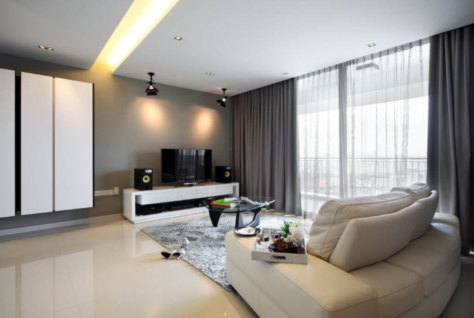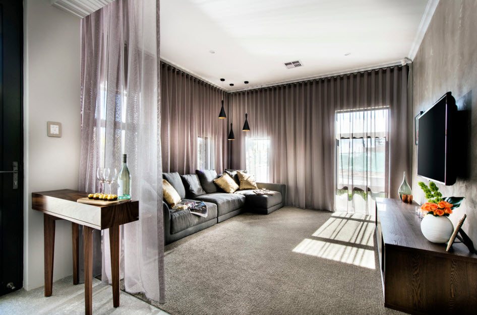 На стандартный карниз в зале можно повесить классические гардины или раздвижные шторы, дополнив легким тюлем. Этот вариант считается беспроигрышным, особенно в сочетании с подхватами чуть ниже середины длины.