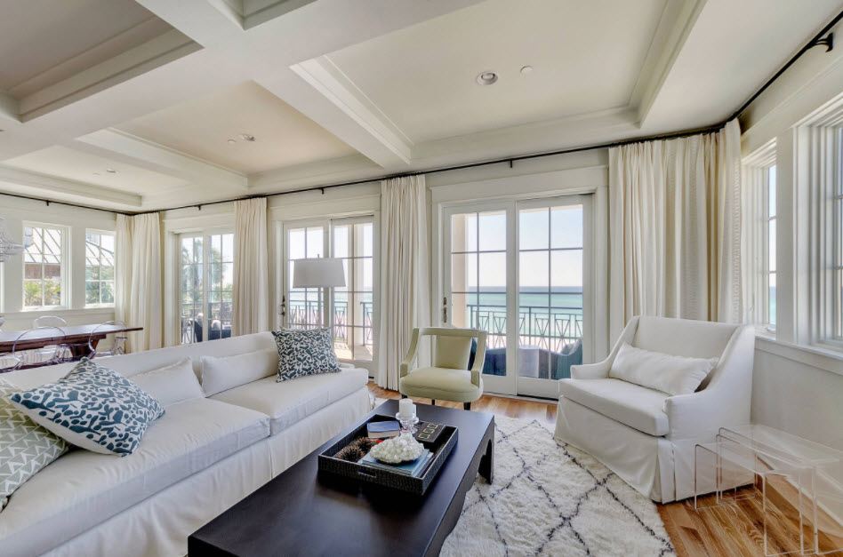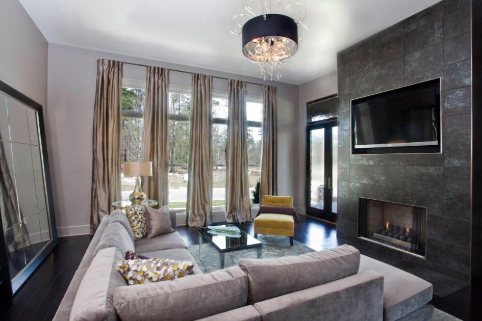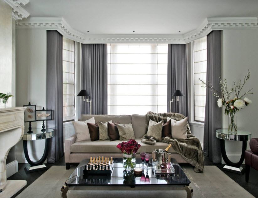 Классический стиль все же более востребован для гостиной. Достаточно украсить окно струящимися шторами и тюлем, который упадет выраженными глубокими складками. Это самый простой способ оформления. Портьеры лучше выбрать однотонные. Такой вариант считается самым популярным в текущем сезоне.