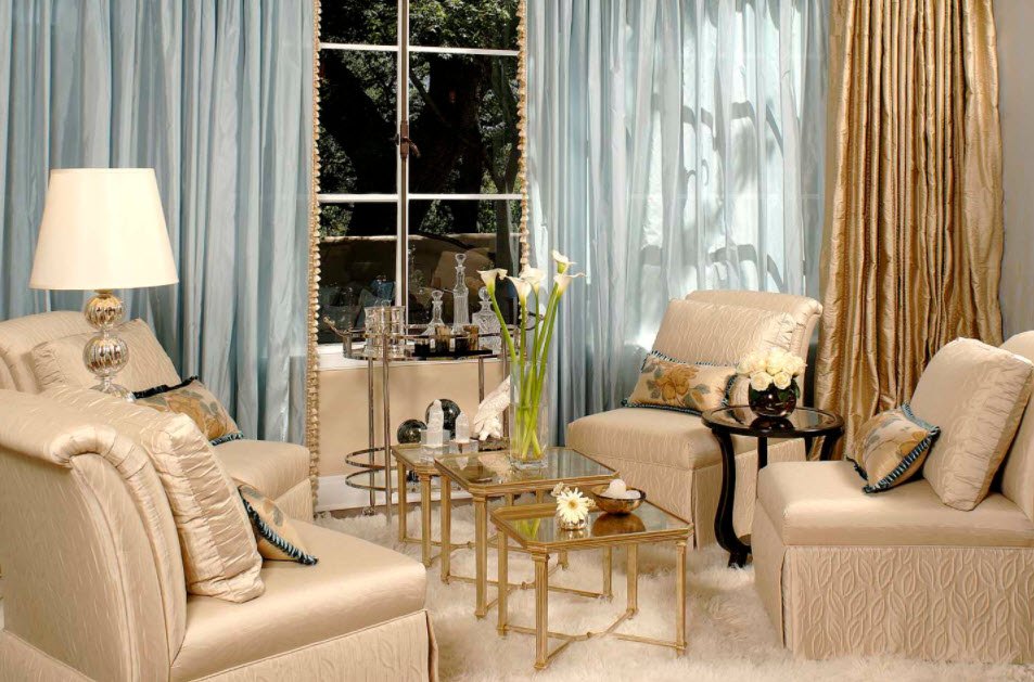 Здесь важно гармонично сочетать цвет штор с оттенком отдельных элементов гостиной