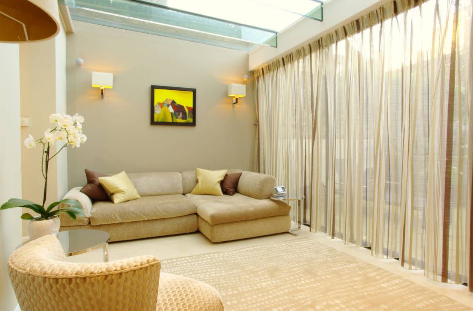 Красиво оформить окна можно популярными сегодня рулонными портьерами, выполненными из таких натуральных тканей, как, например, лен или хлопок. Для небольшой залы подойдут материалы однотонных оттенков. Отлично будут смотреться рулонные полотна с принтом, которые отлично сочетаются с однотонными занавесками. Именно этот декор отлично дополняет спокойный дизайн помещения.