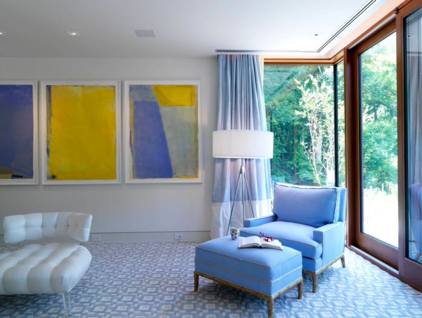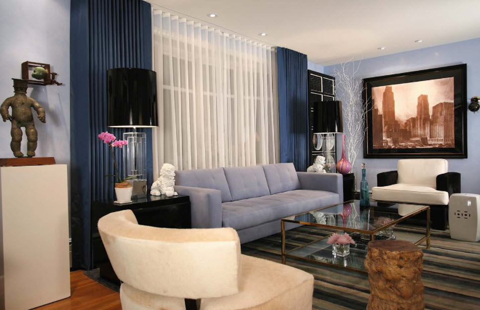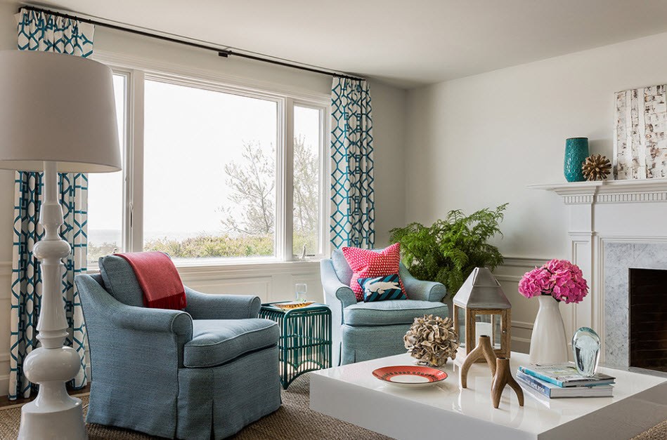 - Сочетание нескольких стилей. Для того чтобы красиво обыграть небольшие окна, в настоящее время используется эклетика. Модно смешивать однотонные материи с ярким крупным узором. Такими являются геометрические фигуры, цветочные принты, имитация кожи рептилий. Сейчас как никогда актуальны шторы с узором одного тона. Пример: синие гардины и принт из синих кругов.