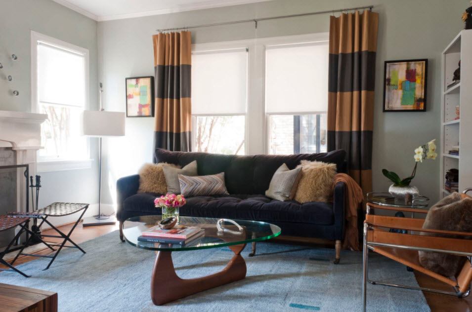 Для гостиной можно использовать римские штор в каркасной или бескаркасной модификации. Такие занавески спускаются чуть ниже подоконника, а при необходимости собираются вверх в изящные складки. Их можно использовать как отдельно, так и в сочетании с длинными шторами. Такие модели бывают однотонными и цветными. Последние комбинируют только с однотонными длинными гардинами. Римские шторы сами по себе являются украшением. Рекомендуется подбирать их в гармонии с остальным текстилем в комнате.