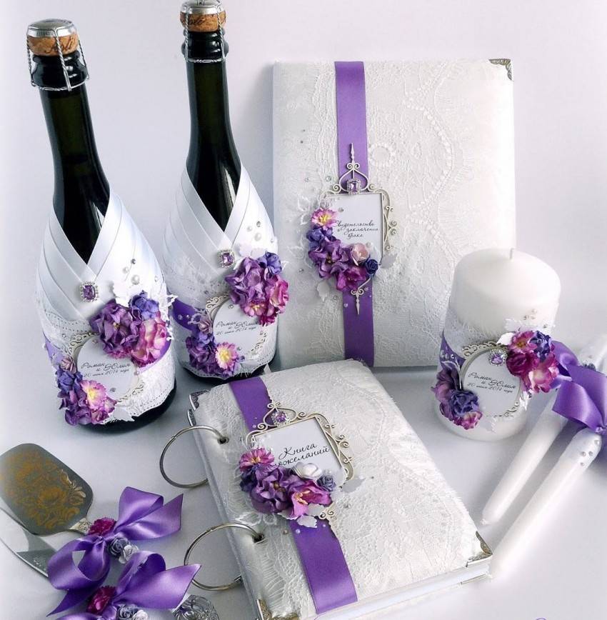 Свечи широко используются для убранства банкетного зала. Они также нужны для церемонии зажжения семейного очага. В качестве нашивки используются те же материалы, что и для бокалов, также можно дополнить наличием маленьких искусственных цветов или росписью. Свечи ставятся в обычные стеклянные банки, украшенные кружевом или лентой. Если праздник проходит в кафе, нужно поинтересоваться у хозяев о том, можно ли зажигать свечи.