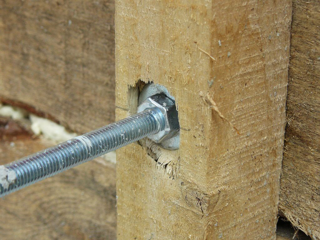 Отрезки труб вставляются внутрь конструкции, и через них и подготовленные заранее отверстия пропускается шпилька, на которой с двух сторон затягиваются гайки.