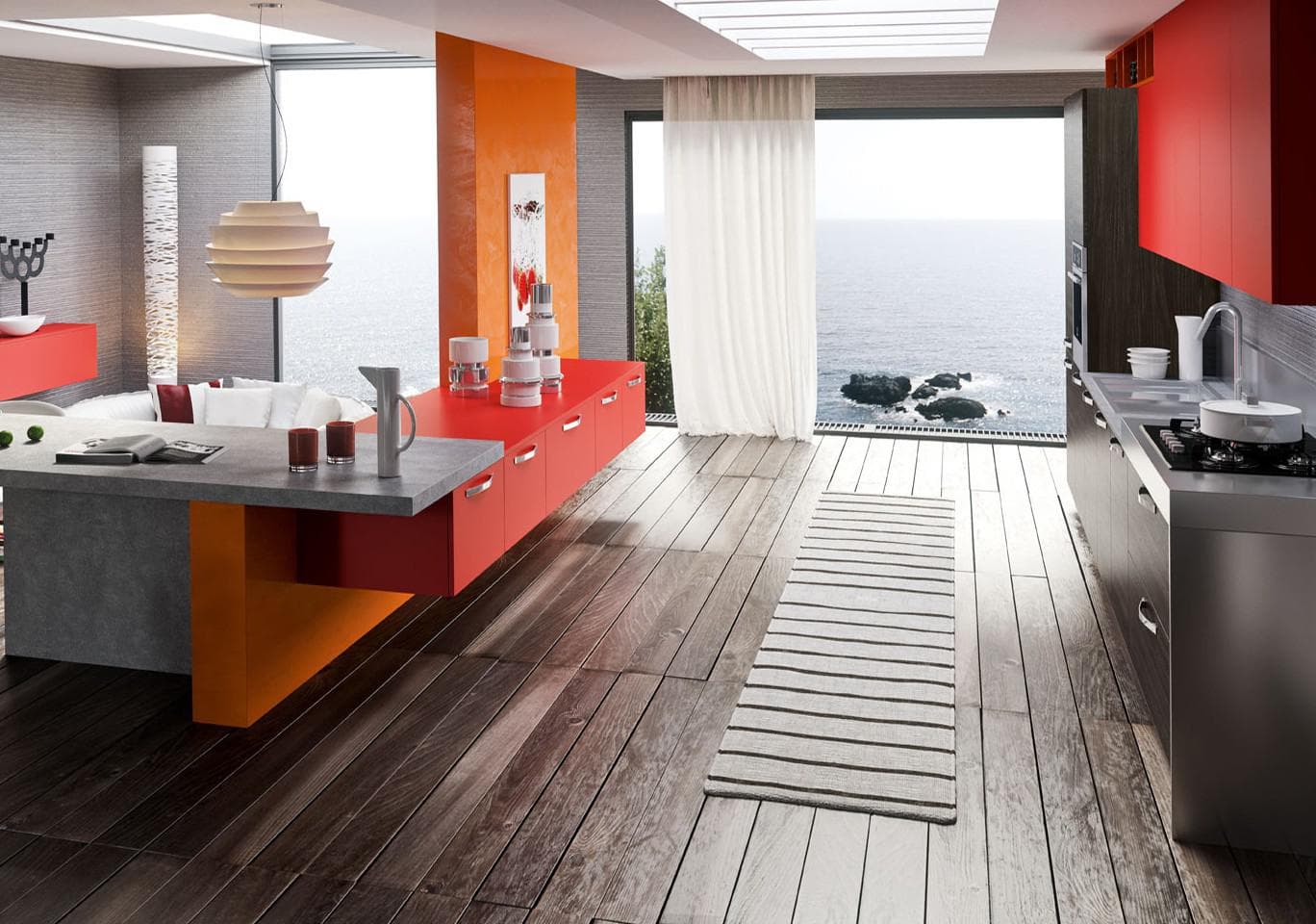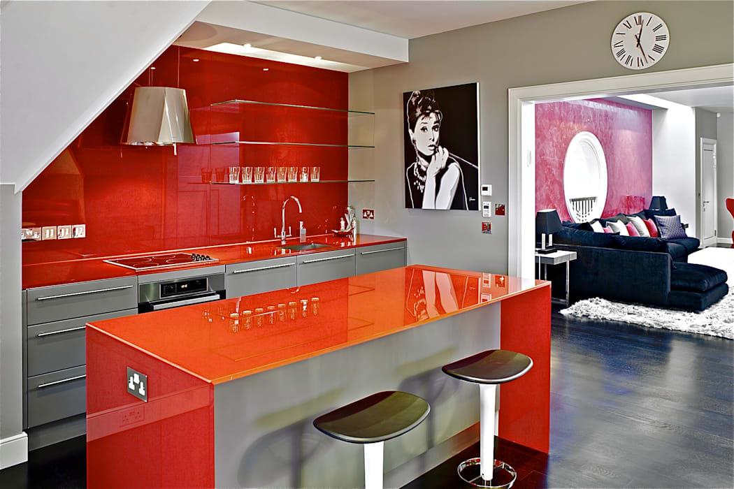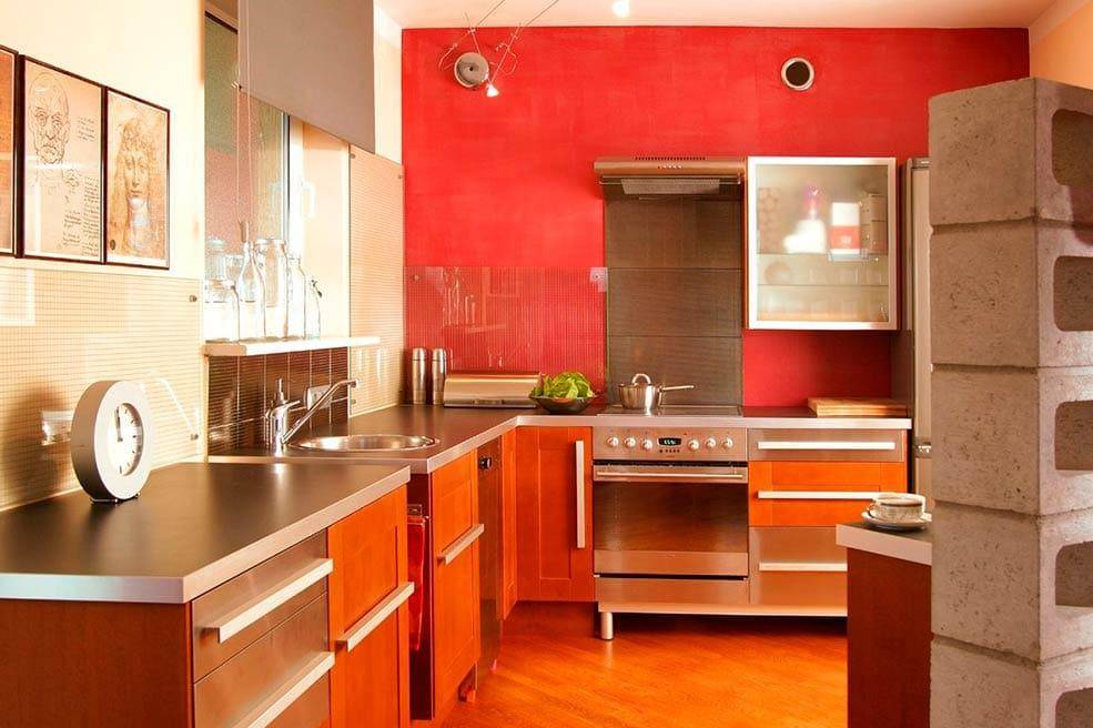 Кухня оранжевого цвета исключительно совместима с красными оттенками. Чтобы интерьер не выглядел агрессивно, их сочность приглушается слоновой костью, бежевым, нейтральным серым или белым.