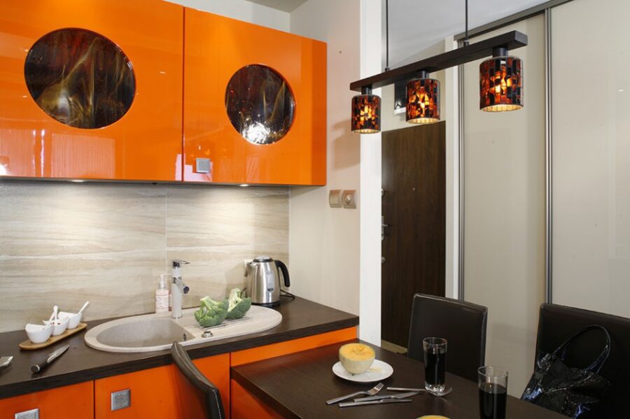 Оранжевая гарнитуром требует дополнительной подсветки. Её устанавливают под верхние шкафы. Направленный свет точечных приборов облагораживает интерьер, делая его более конкретным.