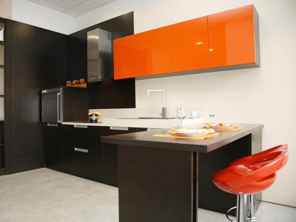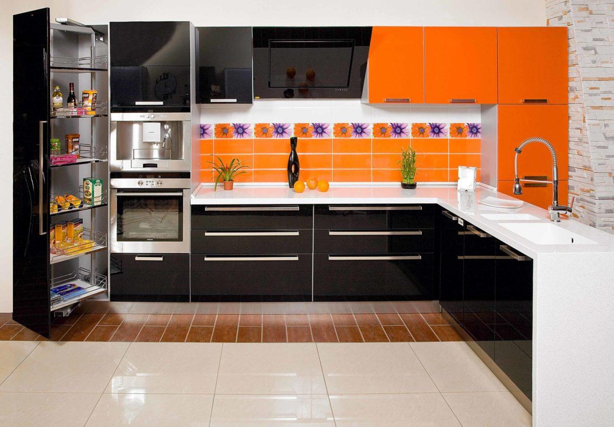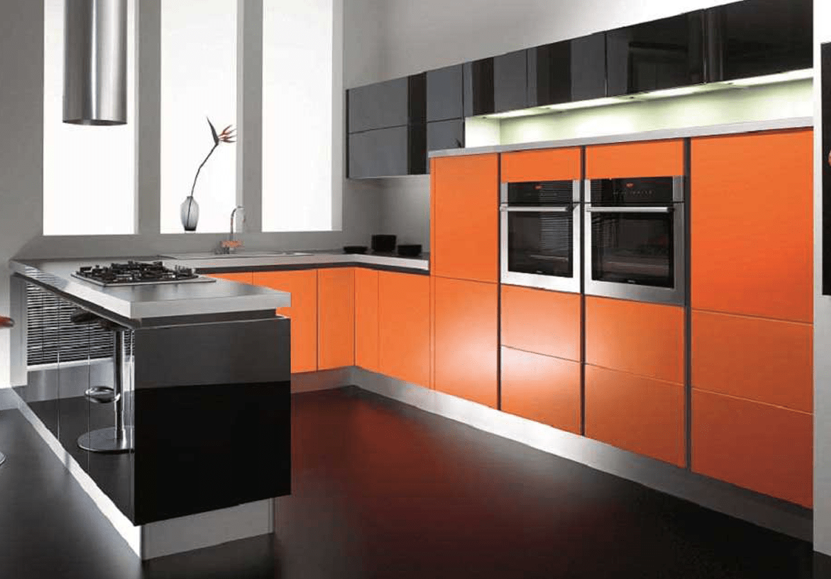 Чёрно-оранжевая кухня используется для дизайна помещений в стиле Хай-Тек. Использовать только эти два цвета неправильно. Уместны элементы белого, серого, бежевого оттенков.