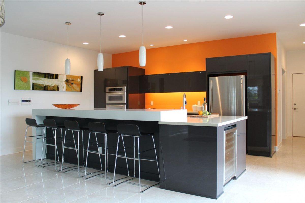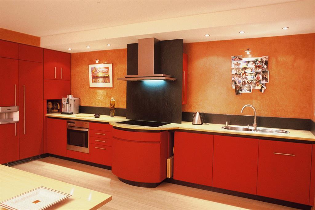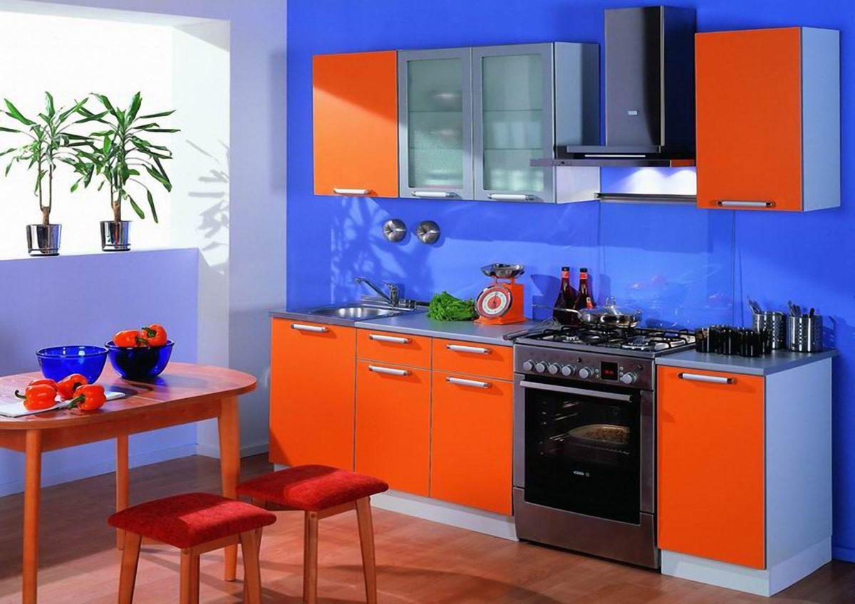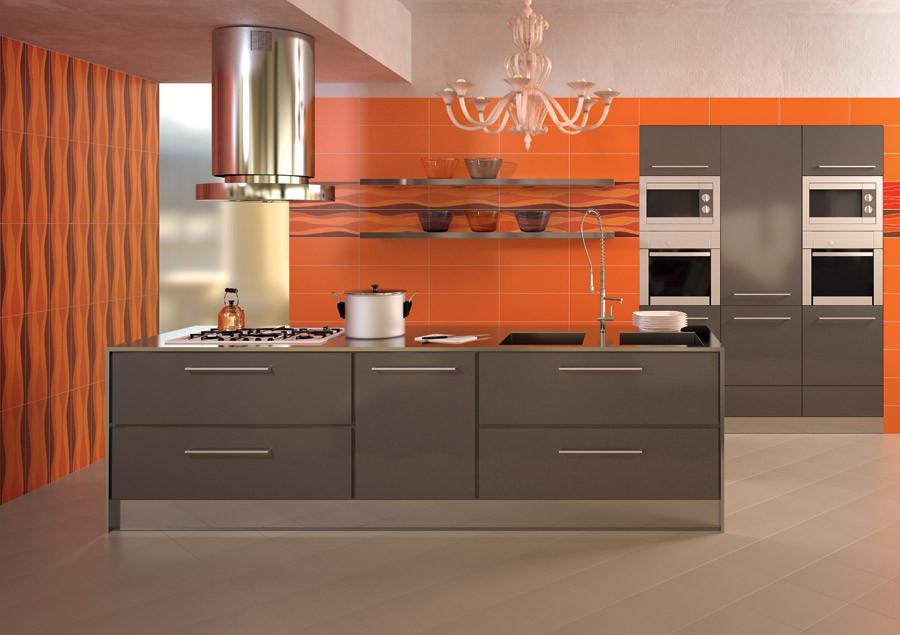 Апельсиновый можно использовать в качестве фона, но в пропорции 1 к 1 с другим оттенком. Такое сочетание смотрится гармонично, но подходит далеко не для каждой кухни. Активный фон хорош лишь в ряде случаев: