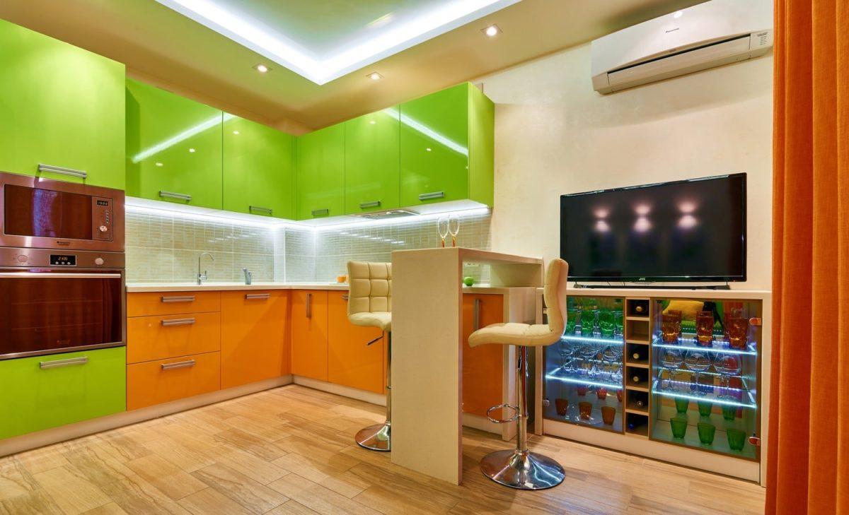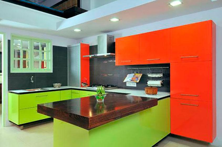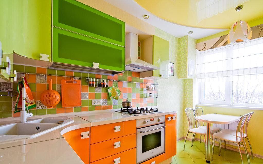 В продолжение Эко-тематики стоит рассмотреть возможности палитры в оранжево-зелёной кухне. Эти два цвета считаются лучшими компаньонами для композиционных решений.