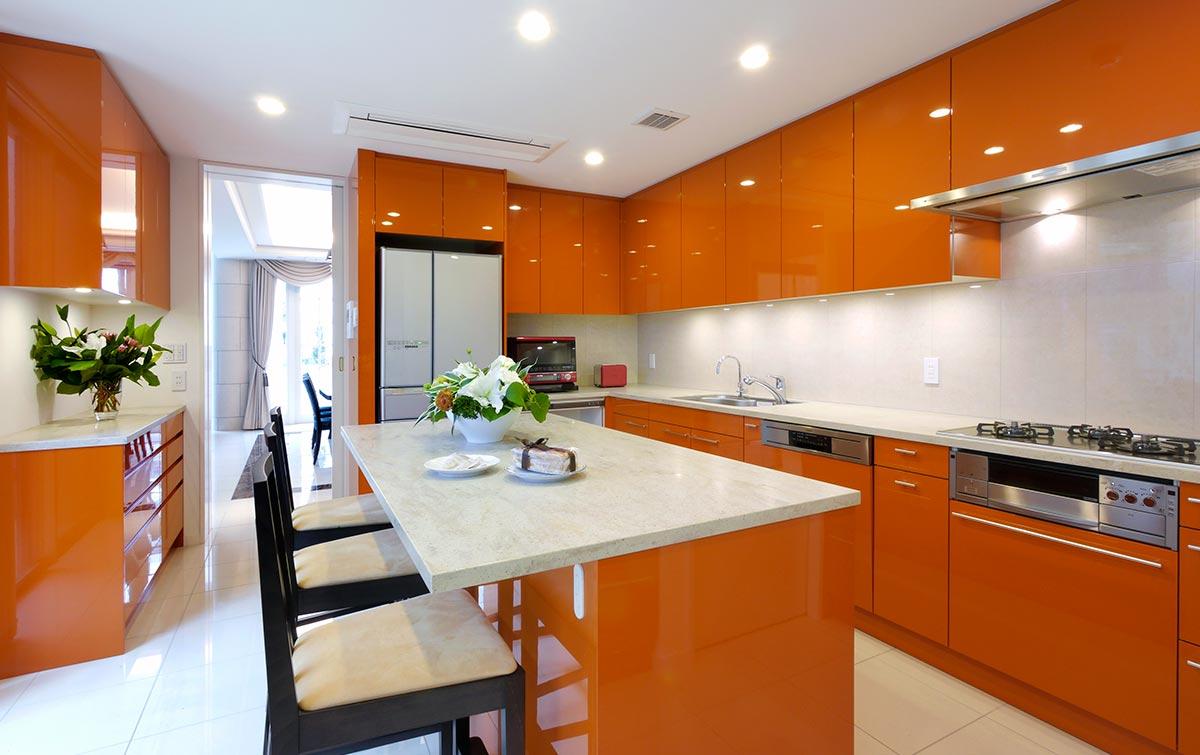 В больших помещениях и с практической, и с дизайнерской точки зрения часто напрашивается кухня-остров. За счет обширного пространства вокруг оранжевые фасады острова и пристенных шкафов будут главенствовать, но не давить. Чем больше помещение, тем более щедрым по количеству здесь может быть оранжевый цвет.