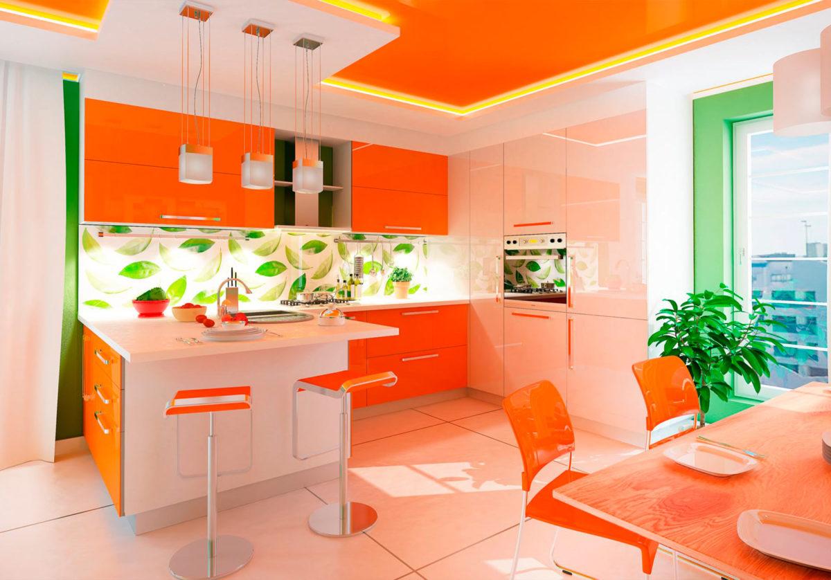 Какой выбрать потолок? Изысканно и необычно смотрится глянцевый натяжной потолок, который отражает проблески ярких цветов, это очень интригующе и эффектно! Такой потолок наиболее уместен в оранжевой кухне. Если же вы хотите сделать сам потолок оранжевого цвета, то натяжное полотно – подойдет как нельзя лучше, но будьте осторожны