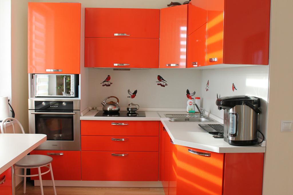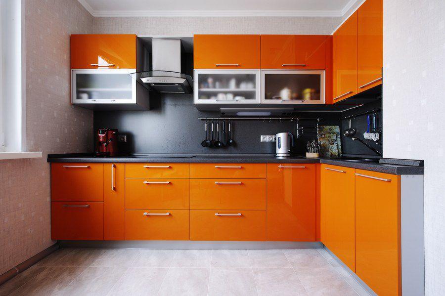 Чем насыщеннее цвет, тем более дробно он должен использоваться. Оранжевый любит простор. Поэтому апельсиновый гарнитур можно приобретать лишь для помещений более 16 кв м. Если кухня у вас меньших габаритов, то стоит ограничиться отдельными оранжевыми элементами.