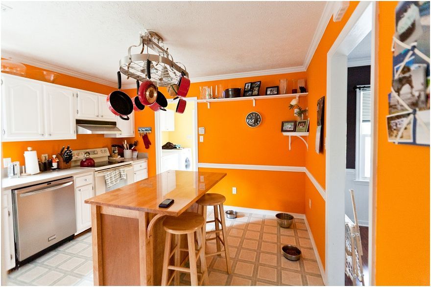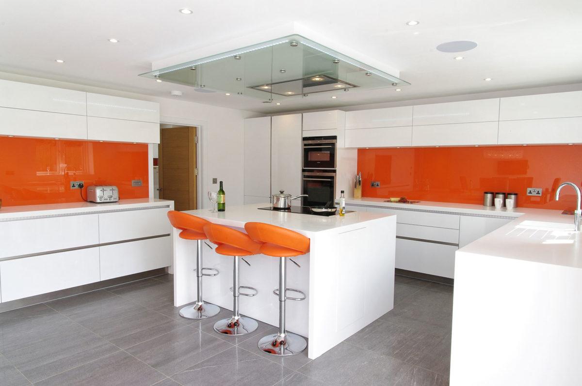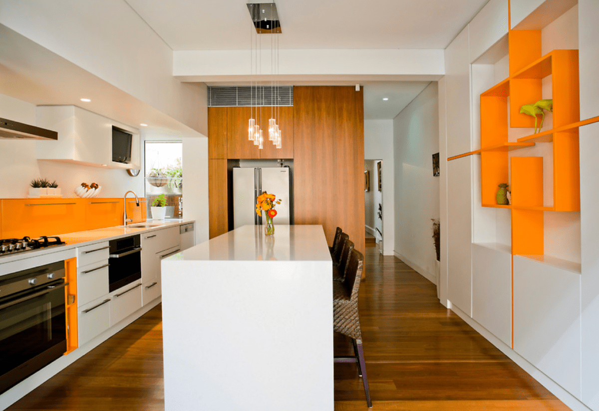 Апельсиновые оттенки отлично работают в паре с белым цветом на кухне