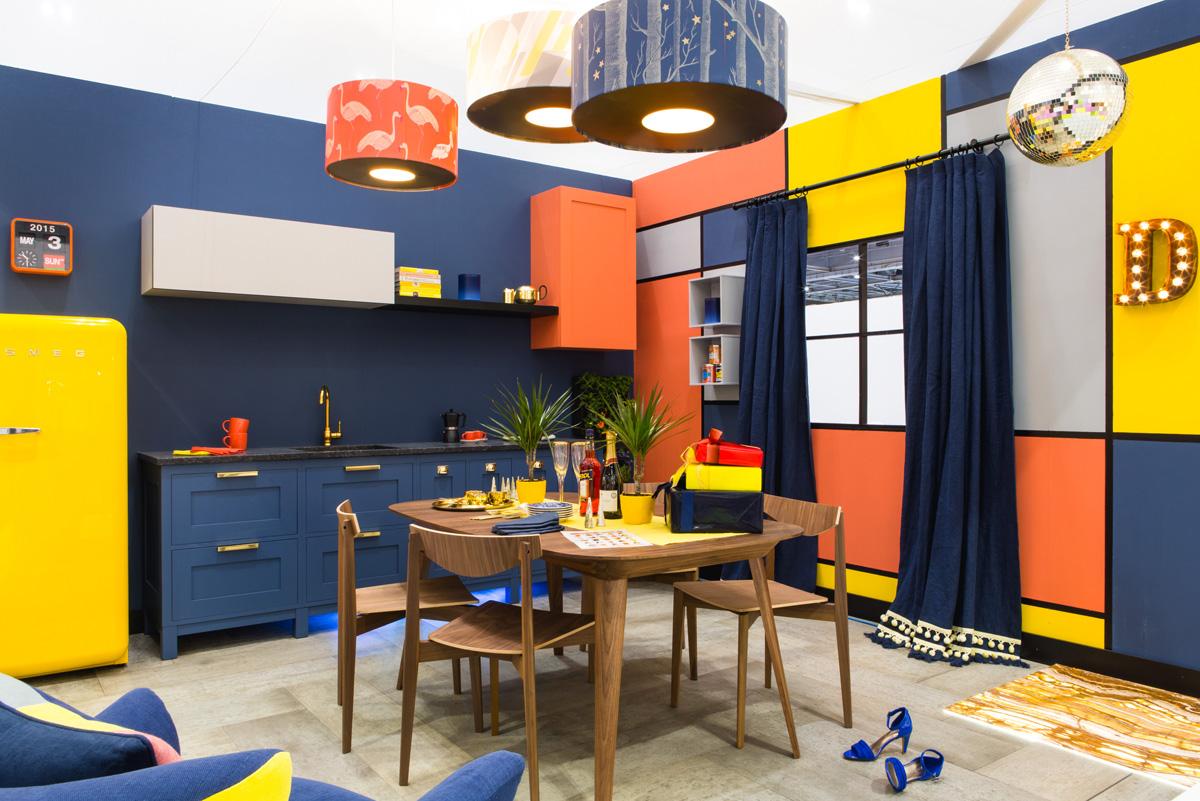 Честно говоря — на любителя. Дизайн нечасто встречается в проектах из-за непредсказуемости окончательного варианта. Голубой — не самый удачный цвет для кухни, но на его фоне хорошо смотрятся апельсиновые: