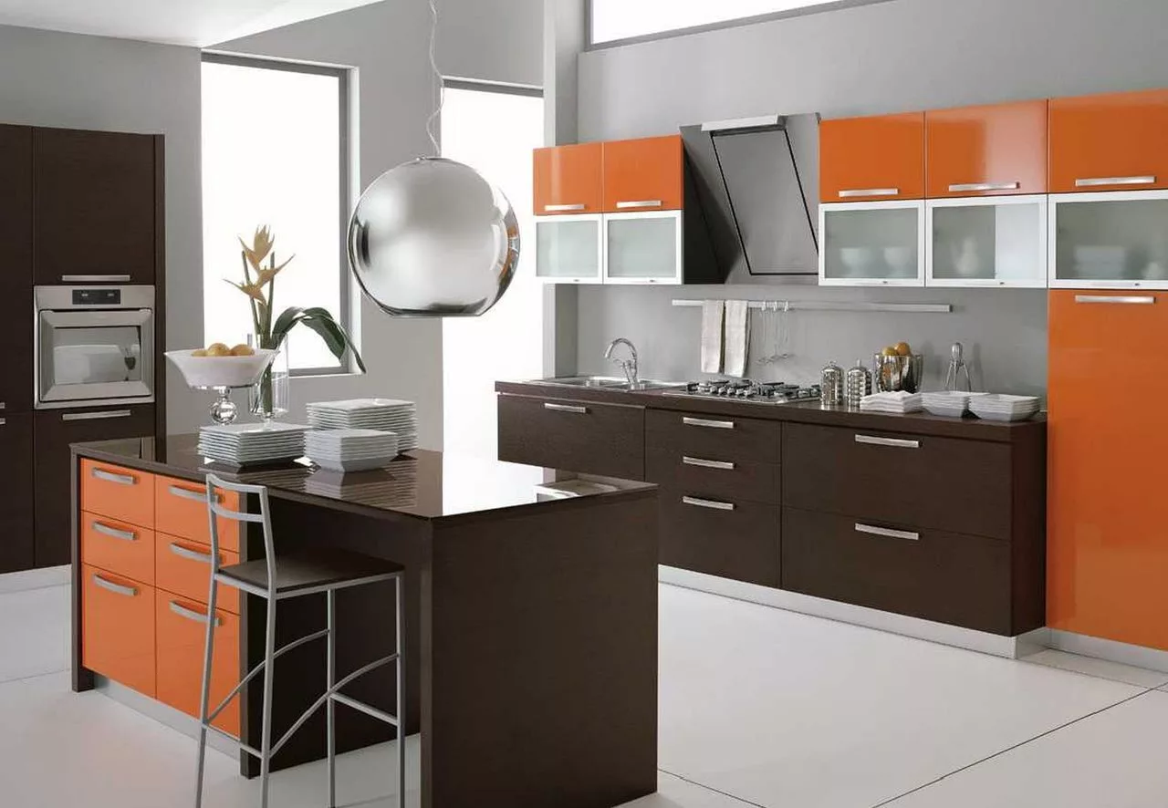 Дизайн оранжевой кухни гармонично дополняется всеми оттенками коричневого. Оба цвета привносят атмосферу тепла и домашнего уюта. Наилучшими сочетаниями являются: