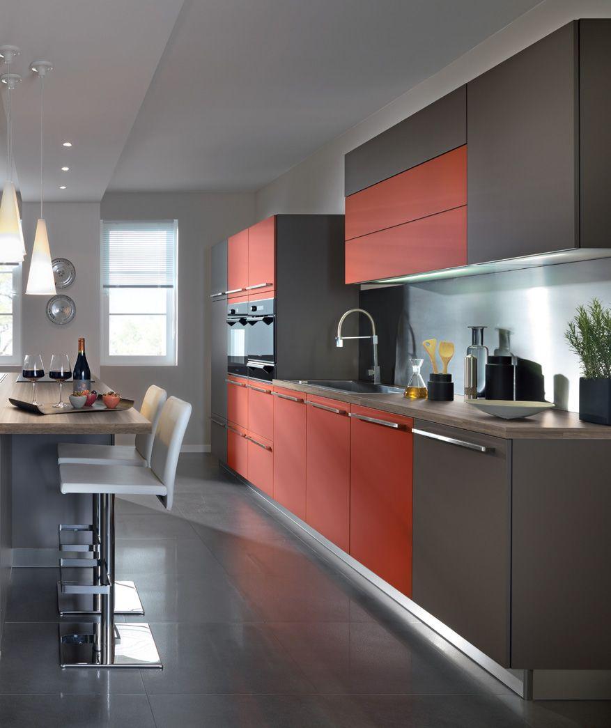 На фото современная серая кухня, дополненная яркими красными акцентами.