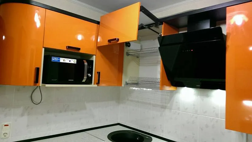 Свежий оранжевый придает кухне элегантный современный стиль. Яркие и глянцевые поверхности украсят даже весьма компактную комнату и без естественного освещения.