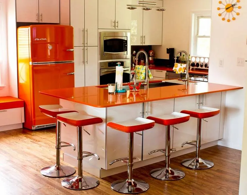 Сочный цвет способствует пищеварению и улучшает аппетит. Ламинированная кухонная рабочая поверхность с оттенком ржавчины, меди, хурмы или шафрана непременно освежит внешний вид простой кухни.
