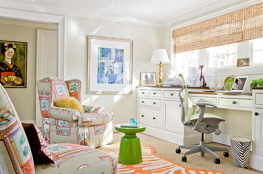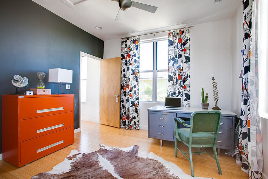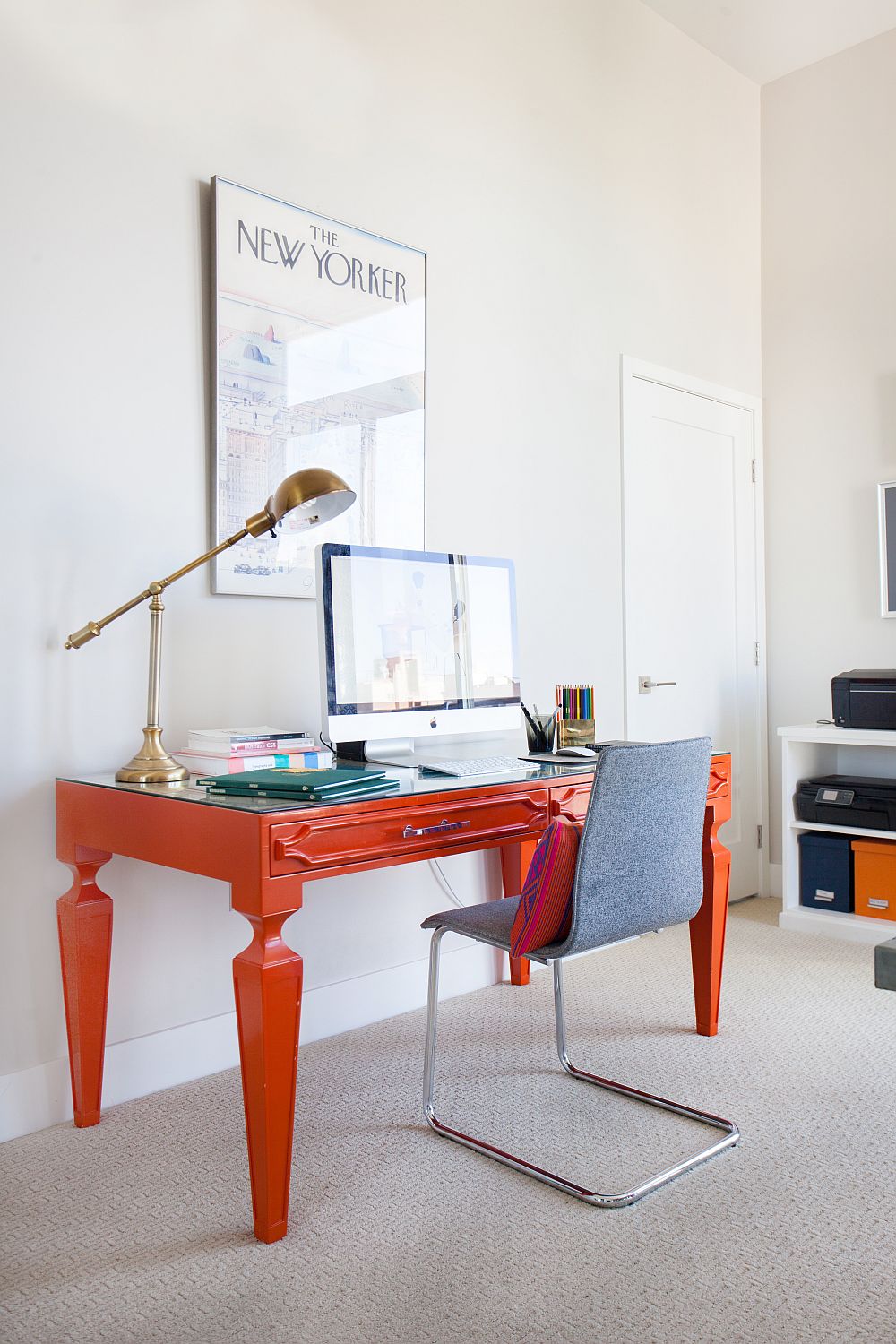 Приобретите шикарный оранжевый стол, что сможет стать великолепным координационным центром, или добавьте столь необходимую картотеку в колоритном исполнении.