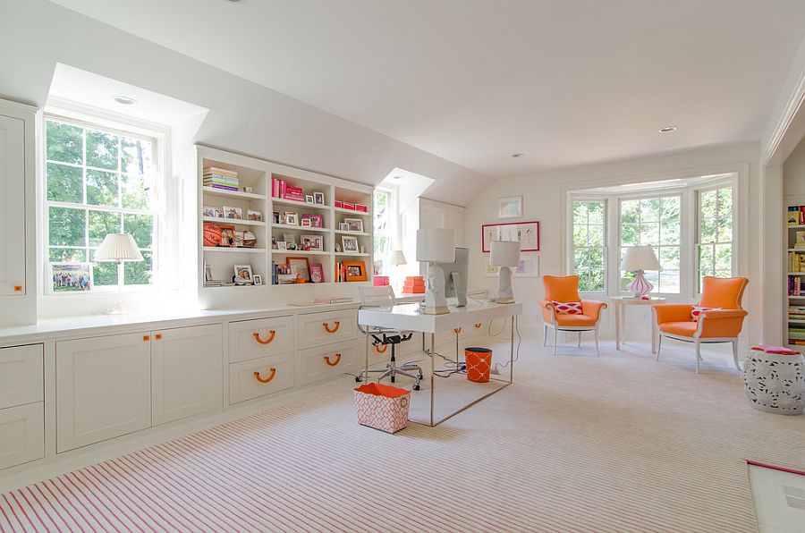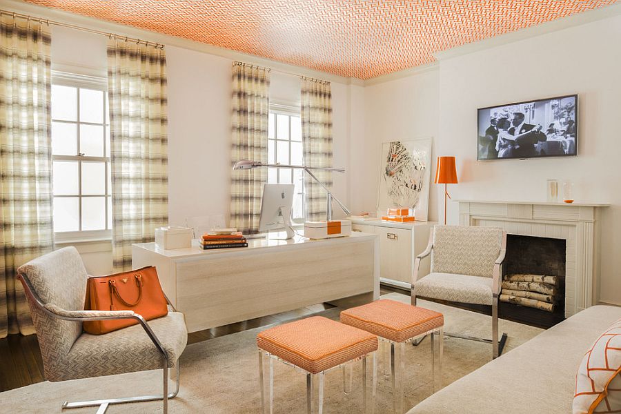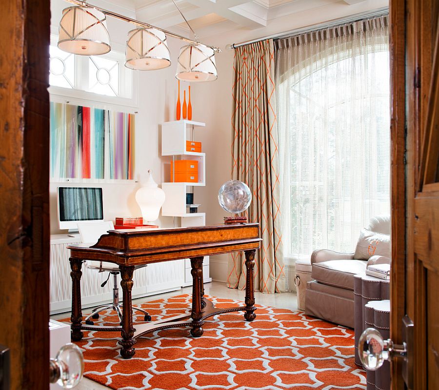 офис (домашний кабинет). Оранжевый не подходит для комнат, в которых отдыхают и расслабляются, для романтических спален, а также для слишком светлых и жарких комнат.