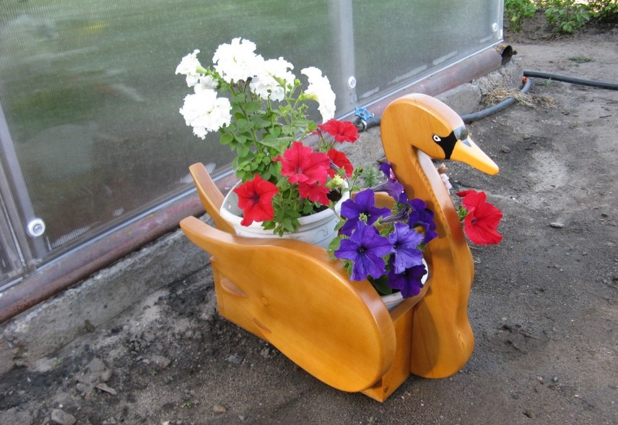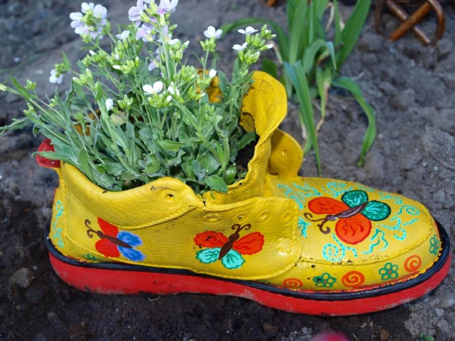 В саду великолепно выглядят подвесные кашпо. Этими поделками украшают отдельные деревья, места для чаепития, веранды. А изготовить кашпо можно из старых шляп, сумок, макраме, ботинок, резиновых игрушек и так далее.